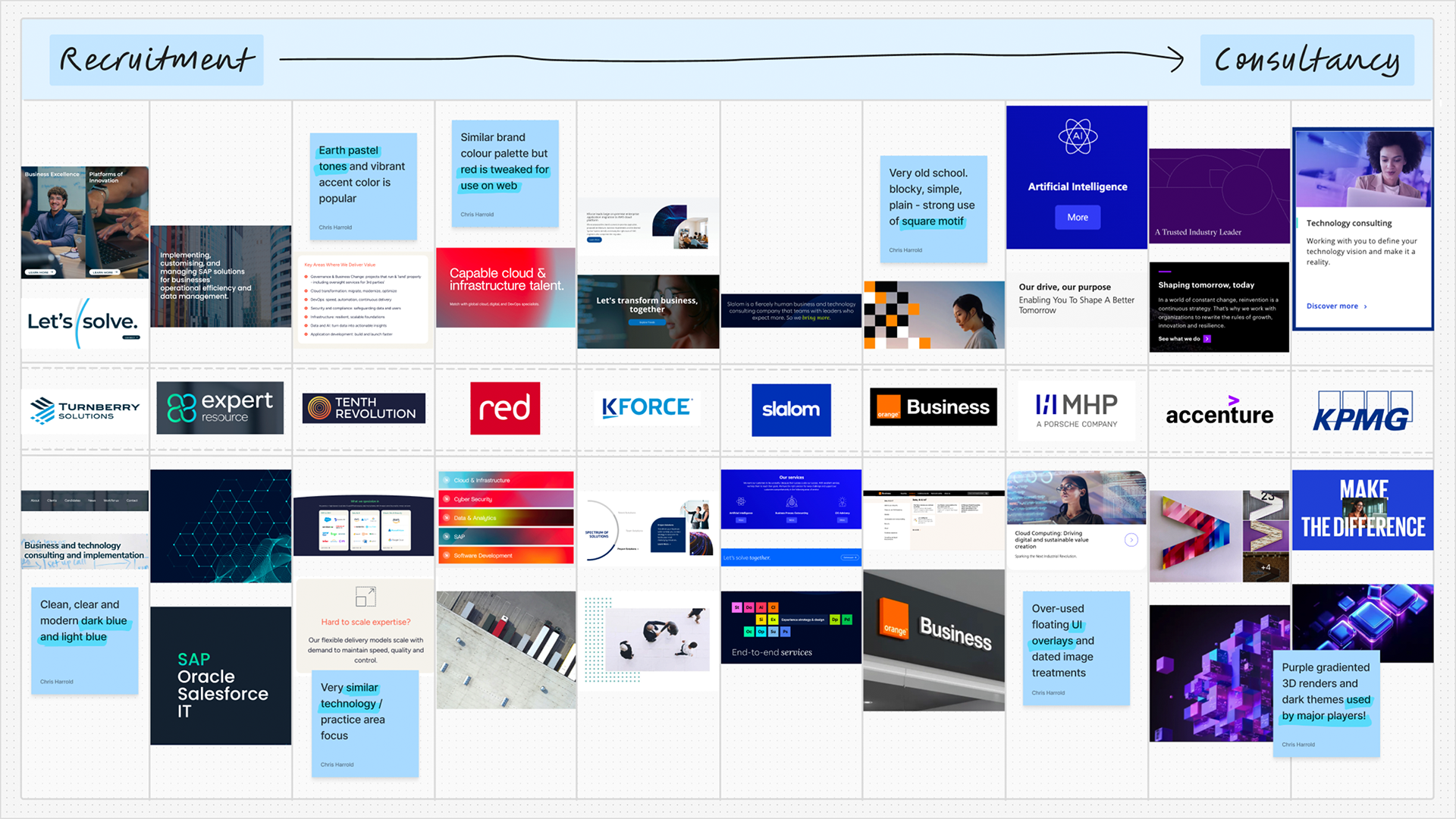 Competitor Analysis: Competitors' were categorised as specialist or generalist, recruiter or consultancy. Their art direction, messaging and colour palettes were analysed to discover commonalities and gaps in the market.